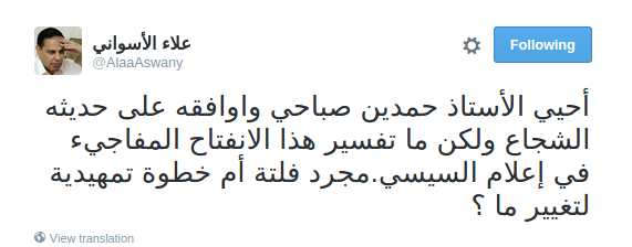 واستنكر الكاتب علاء الأسواني، رفض حمدين صباحي نزول الشباب يوم 25 يناير القادم؛ إذ قال “أحيي الأستاذ حمدين صباحي وأوافقه على حديثه الشجاع ولكن ما تفسير هذا الانفتاح المفاجئ في إعلام السيسي، مجرد فلتة أم خطوة تمهيدية لتغيير ما؟”.