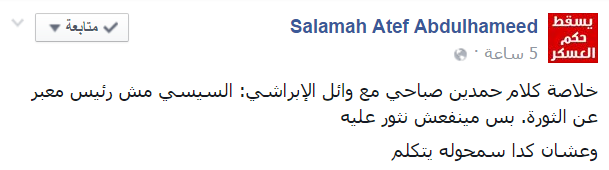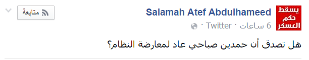 وتساءل الكاتب سلامة عبدالحميد، قائلًا: “هل تصدق أن حمدين صباحي عاد لمعارضة النظام؟”، مضيفًا -عبر عدة منشورات له في حسابه بموقع “فيس بوك”- “خلاصة كلام حمدين صباحي مع وائل الإبراشي: السيسي مش رئيس معبر عن الثورة، بس مينفعش نثور عليه، وعشان كدا سمحوله يتكلم”.