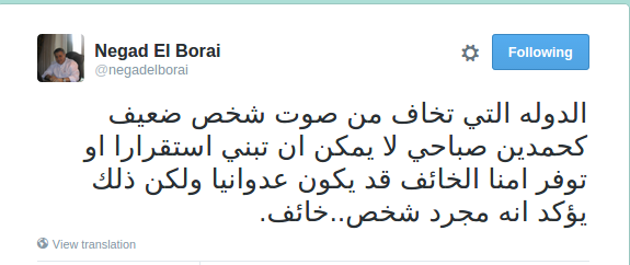 ورأى الناشط الحقوقي نجاد البرعي، أن الدولة التي تخاف من حمدين صباحي لن تستطيع بناء الاستقرار؛ إذ قال -في تغريدة على “تويتر”-: “الدولة التي تخاف من صوت شخص ضعيف كحمدين صباحي لا يمكن أن تبني استقرارًا أو توفر أمنًا، الخائف قد يكون عدوانيًا ولكن ذلك يؤكد أنه مجرد شخص خائف”.