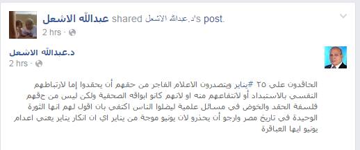 قال “الأشعل”: إن “الحاقدين على ٢٥ يناير يتصدرون الإعلام الفاجر من حقهم أن يحقدوا إما لارتباطهم النفسي بالاستبداد أو لانتفاعهم منه أو لأنهم كانوا أبواقه الصحفية”.
