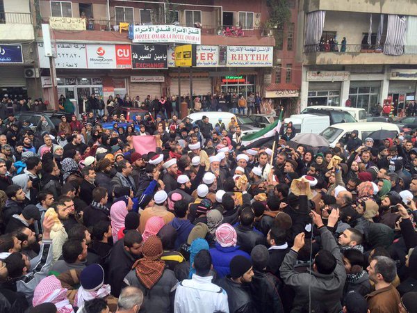 نشر الناشط والإعلامي السوري هادي العبدالله صورًا لمتظاهرين لبنانيين يقطعون طريق المصنع الدولية احتجاجا على حصار بلدة مضايا السورية من قِبل عناصر حزب الله اللبناني الموالية لنظام الأسد في سوريا.