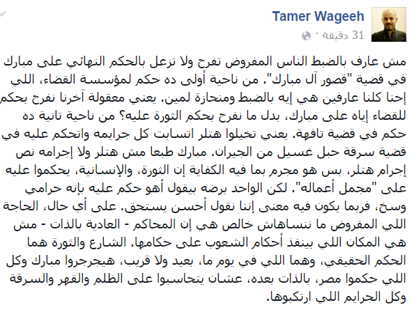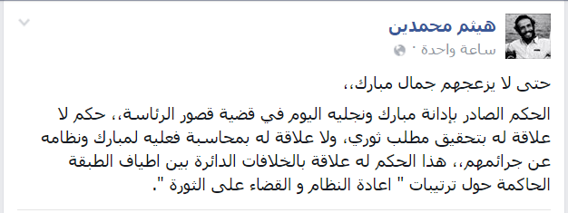 وقال- عبر منشور له على “فيسبوك”-: “من ناحية أولى ده حكم لمؤسسة القضاء، اللي احنا كلنا عارفين هي إيه بالضبط ومنحازة لمين، يعني معقولة آخرنا نفرح بحكم للقضاء إياه على مبارك، بدل ما نفرح بحكم الثورة عليه؟ من ناحية تانية ده حكم في قضية تافهة، يعني تخيلوا هتلر اتسابت كل جرايمه واتحكم عليه في قضية سرقة حبل غسيل من الجيران”.
