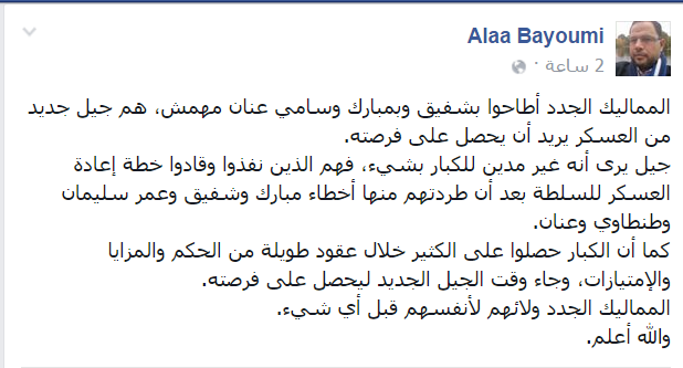 وتابع متهكما: “كما أن الكبار حصلوا على الكثير خلال عقود طويلة من الحكم والمزايا والامتيازات، جاء وقت الجيل الجديد ليحصل على فرصته.. المماليك الجدد ولاؤهم لأنفسهم قبل أي شيء”.