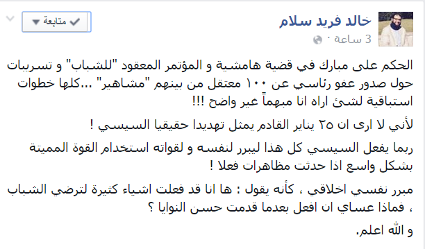 وعلل “سلام” ذلك بقوله في منشور له على حسابه في موقع “فيس بوك”: “لا أرى أن ٢٥ يناير القادم يمثل تهديدا حقيقيا للسيسي”، مضيفا: “ربما يفعل السيسي كل هذا ليبرر لنفسه ولقواته استخدام القوة المميتة بشكل واسع إذا حدثت مظاهرات فعلا!!”.