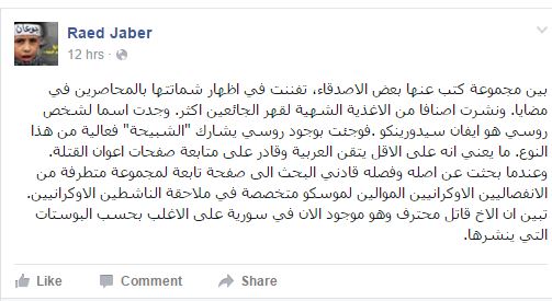 وأوضح “جبر” أنه بعد أن قام بالبحث، استطاع معرفة أن هذا الروسي يتبع مجموعة متطرفة من الانفصاليين الأوكرانيين الموالين لموسكو، وتبين أن سيدورينكو قاتل محترف وهو موجود الآن في سوريا ليشارك في مساندة النظام ضد المعارضة السورية.