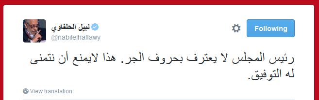 وقال الحلفاوي: “رئيس المجلس لا يعترف بحروف الجر.. هذا لايمنع أن نتمنى له التوفيق”.