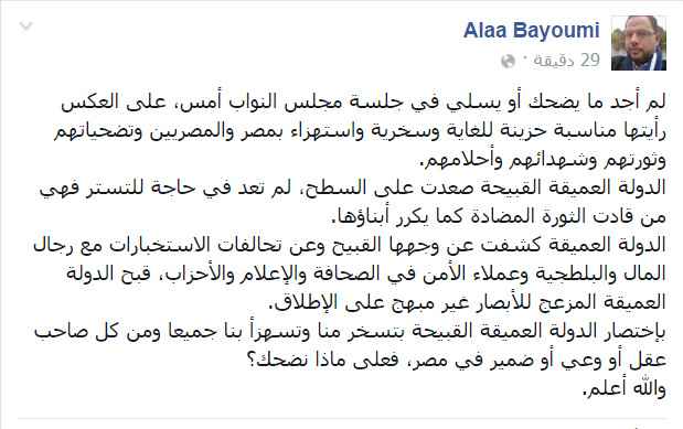 قال الباحث السياسي، علاء بيومي، إن أولى جلسات البرلمان المصري، أمس، كانت بمثابة سخرية واستهزاء بمصر والمصريين وتضحياتهم وثورتهم وشهدائهم وأحلامهم، مشيرًا إلى أنها كانت حزينة وليس فيها ما يضحك أو يسلي.