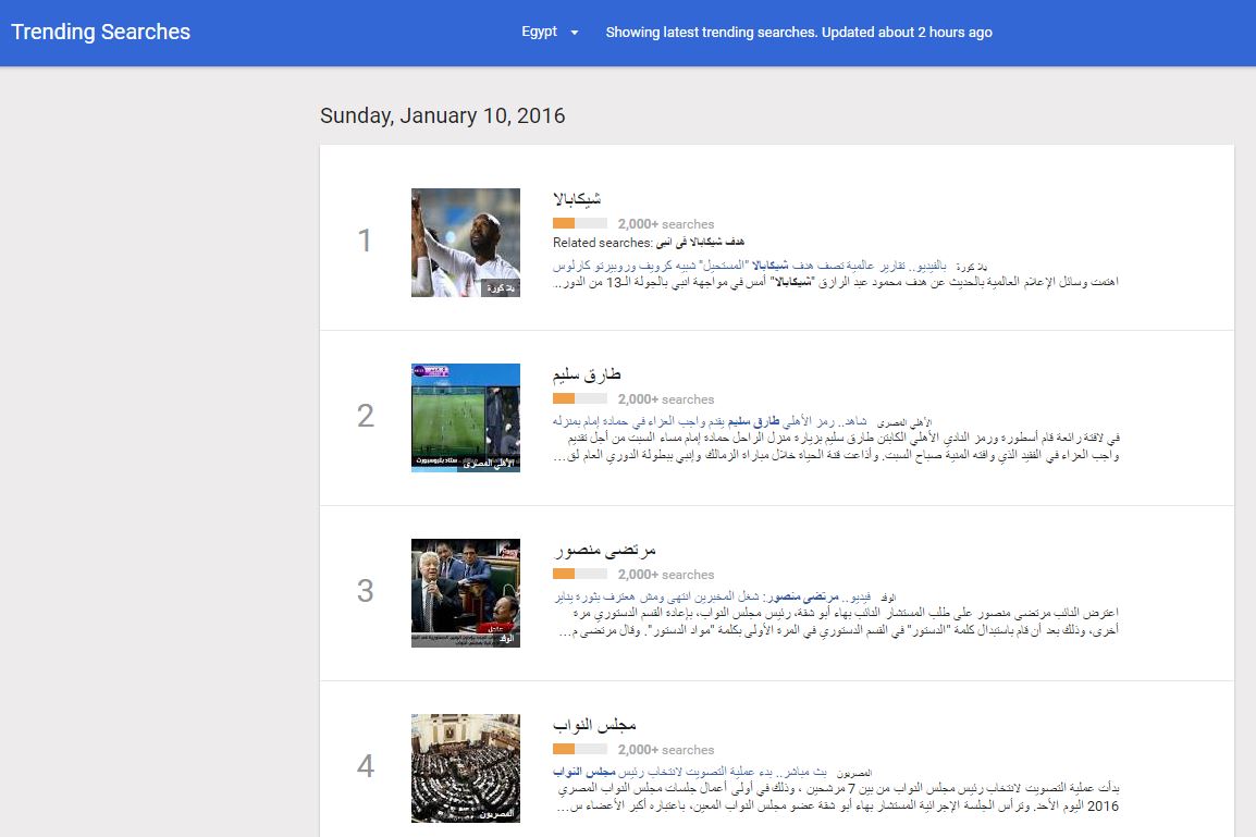 كشفت “جوجل هوت ترنديز” عن أكثر الموضوعات بحثا في الساعات القليلة الماضية، التي اهتم بها الشعب المصري وهي كالآتي:
