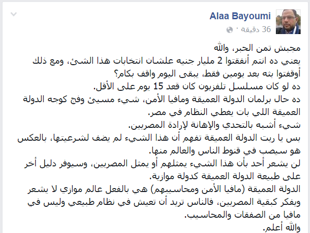 وقال -عبر منسور له على “فيس بوك”-: “يعني ده انتم أنفقتوا 2 مليار جنيه علشان انتخابات هذا الشيء، ومع ذلك أوقفتوا بثه بعد يومين فقط، يبقى اليوم واقف بكام؟ ده لو كان مسلسل تليفزيون كان قعد 15 يوم على الأقل”.