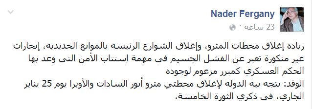 وقال -عبر منشور له على “فيس بوك”-: “زيادة إغلاق محطات المترو، وإغلاق الشوارع الرئيسة بالموانع الحديدية، إنجازات غير منكورة تعبر عن الفشل الجسيم في مهمة استتباب الأمن التي وعد بها الحكم العسكري كمبرر مزعوم لوجوده”.