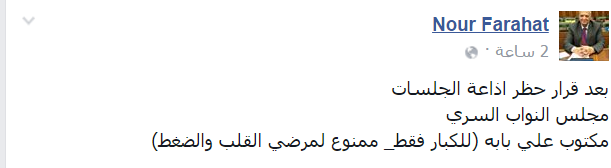 وأضاف -عبر منشور له على “فيس بوك”- “بعد قرار حظر إذاعة الجلسات.. مجلس النواب السري، مكتوب على بابه (للكبار فقط- ممنوع لمرضى القلب والضغط)”.