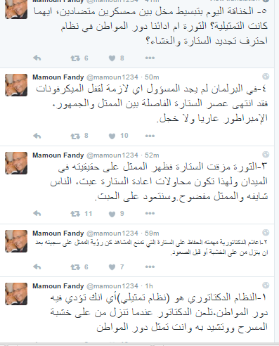 وقال -عبر عدة تغريدات على “تويتر”-: “النظام الدكتاتوري هو (نظام تمثيلي) أي أنك تؤدي فيه دور المواطن، تلعن الدكتاتور عندما تنزل من على خشبة المسرح، وتشيد به وأنت تمثل دور المواطن”.