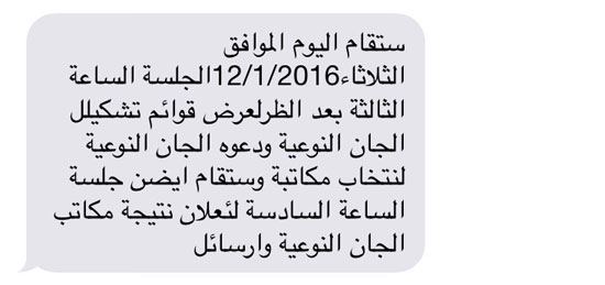 نص الرسالة بالأخطاء: “ستقام اليوم الموافق الثلاثاء 12/1/2016 الجلسة الساعة الثالثة بعد الظر لعرض قوائم تشكيلل الجان النوعية ودعوه الجان النوعية لنتخاب مكاتبة وستقام ايضن جلسة الساعة السادسة لئعلان نتيجة مكاتب الجان النوعية وارسائل”.