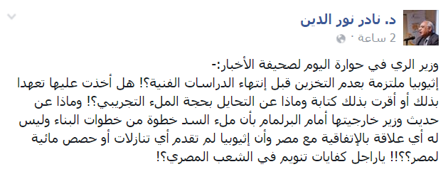 قال نور الدين -عبر منشور له على “فيس بوك”- مخاطبًا وزير الري: “هل أخذت عليها تعهدًا بذلك أو أقرت بذلك كتابة؟ وماذا عن التحايل بحجة الملء التجريبي؟!”.