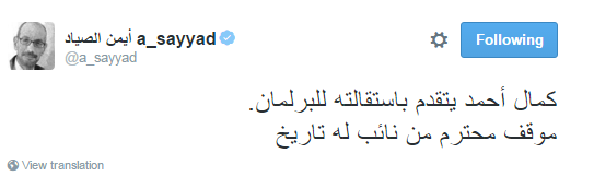 وثمن أيمن الصياد تقدم استقالة النائب كمال أحمد من البرلمان بقوله: “موقف محترم من نائب له تاريخ”.
