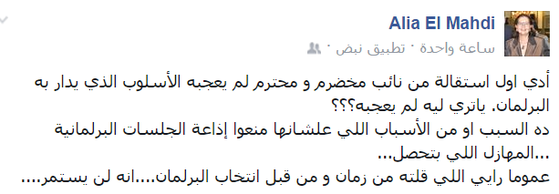 وقالت عالية المهدي، أستاذة العلوم السياسية بجامعة القاهرة: “آدي أول استقالة من نائب مخضرم ومحترم لم يعجبه الأسلوب الذي يدار به البرلمان. يا تري ليه لم يعجبه؟”.
