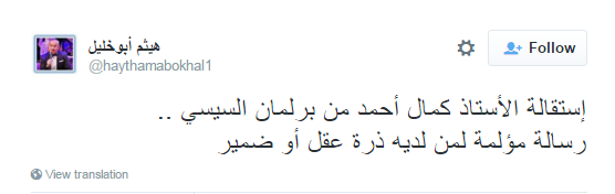 واعتبر الناشط الحقوقي هيثم ابو خليل، أن “إستقالة كمال أحمد من برلمان السيسي رسالة مؤلمة لمن لديه ذرة عقل أو ضمير”.