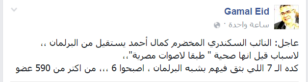 وعلق الناشط الحقوقي جمال عيد بقوله: “كده الـ 7 اللي بثق فيهم بشبه البرلمان، اصبحوا 6 ،،، من اكتر من 590 عضو”.