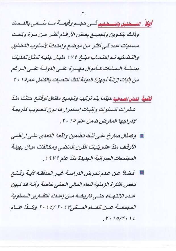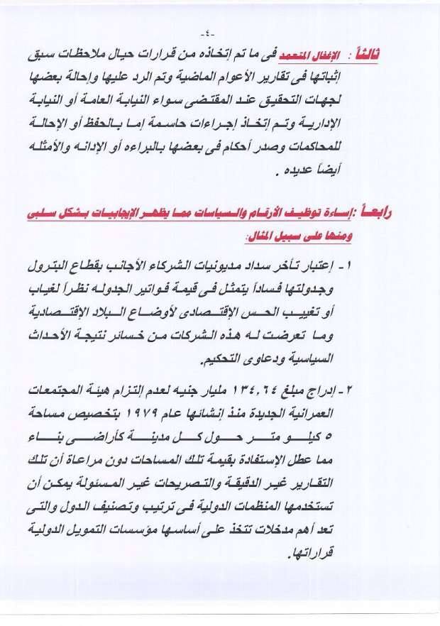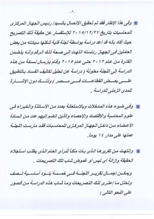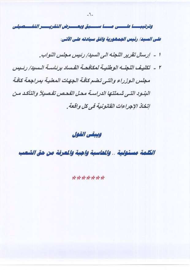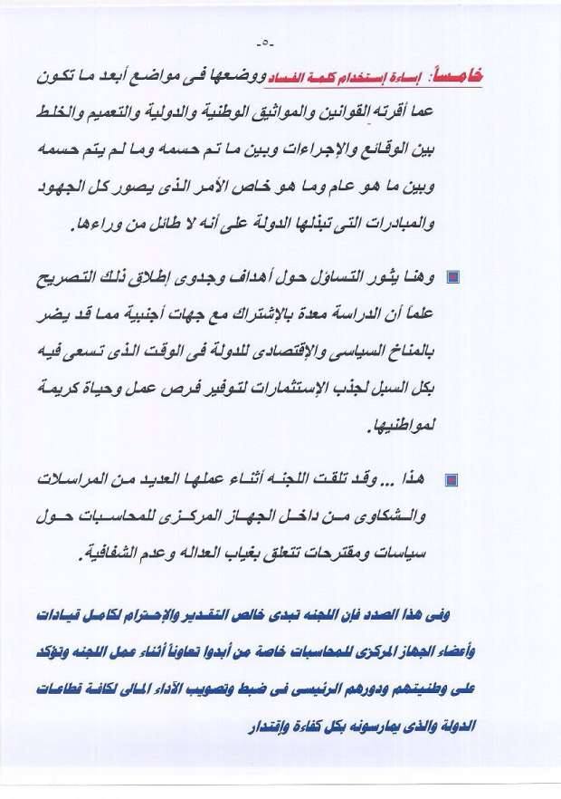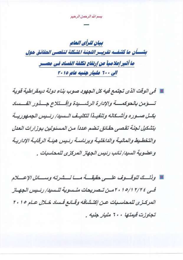 تنشر “رصد” نص تقرير اللجنة الرئاسية للتحقيق في تصريحات المستشار هشام جنينة، رئيس الجهاز المركزي للمحاسبات، حول قيمة الفساد خلال عام 2015؛ حيث أصدر السيسي قرارا بتشكيل لجنة تقصي الحقائق حول الفساد، برئاسة محمد عرفان، رئيس هيئة الرقابة الإدارية.