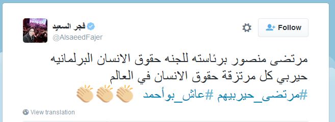 رحبت الكاتبة الكويتية فجر السعيد بتولي المستشار مرتضى منصور عضو مجلس النواب، رئاسة لجنة حقوق الإنسان بالمجلس، وذلك من خلال حسابها الشخصي بموقع التغريدات القصيرة "تويتر"