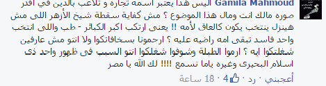– Gamila: “أليس هذا يعتبر تجارة وتلاعب بالدين في أقذر صورة، مالك انت ومال هذا الموضوع، مش كفاية سقطة شيخ الأزهر “اللي مش هينزل ينتخب يكون كالعاق لأمه!!”.
