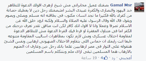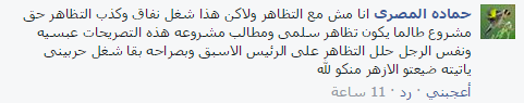 – gamal: “حكمك على الخروج للتظاهر.. بصفتك عميل مخابراتي مش شيخ أزهري، أم بصفتك رجل دين”.
