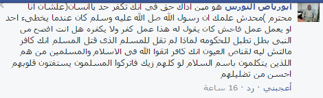 – أبو رياض: “هو مين اداك حق في انك تكفر حد يا انسان (علشان انا محترم) محدش علمك ان الرسول صلى الله عليه وسلم، كان عندما يخطئ أحد، أو يعمل عمل فاحش، كان يقول له: هذا عمل كفر ولا يكفره. هل أنت أفصح من النبي!…..”.