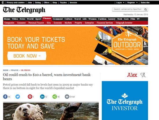 ويضيف المقال: “إن أسعار النفط الحالية التي انخفضت إلى أقل من 30 دولارا، وسط تحذيرات ربما تنخفض إلى نحو 10 دولارات”، مستدلاًّ على ذلك بتوقعات بنك ستاندرد تشارترد، والذي كان آخر البنوك الذي خفض توقعه المستقبلي لأسعار النفط إلى 10 دولارات لينضم بذلك إلى بنوك أمثال غولدمان ساكس وأر بي أس ومورغان ستانلي.