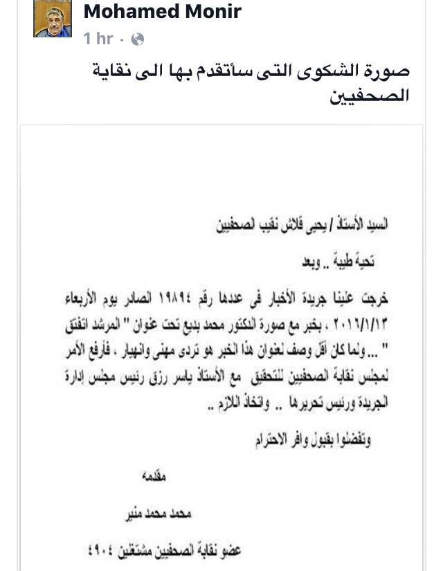 في المقابل تقدم الكاتب الصحفي محمد منير بشكوى رسمية إلى نقابة الصحفيين ضد جريدة الأخبار لتجاوزها حدود المهنية فيما أبرزته اليوم على صدر صفحاتها الأولى بشأن إجراء عملية لمرشد جماعة الإخوان المسلمين، الدكتور محمد بديع.