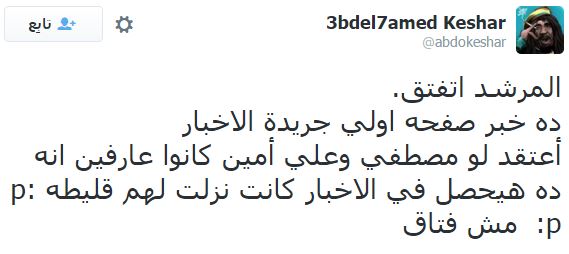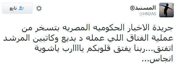 اشتعلت مواقع التواصل الاجتماعي بعدد من التعليقات الغاضبة من صحيفة “الأخبار” الحكومية المصرية، ثاني أكبر الصحف المصرية، الأربعاء، بعد نشرها صورة للمرشد العام لجماعة “الإخوان المسلمين”، الدكتور محمد بديع، وتحتها عنوان يقول: المرشد “اتفتق”.