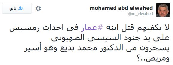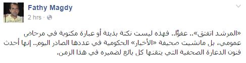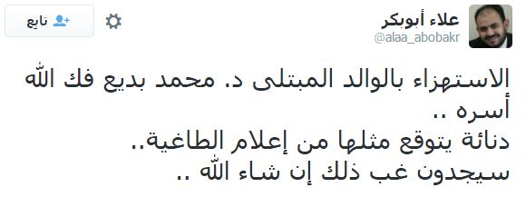 وأشار المدون فتحي إلى شماتة الجريدة في المرشد العام للإخوان المسلمين الدكتور محمد بديع،