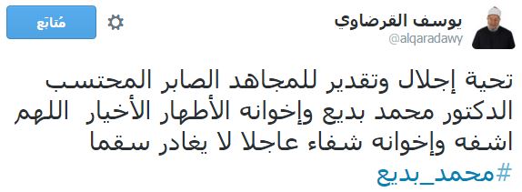 ووجه يوسف القرضاوي، رئيس الاتحاد العالمي لعلماء المسلمين، تحية إجلال وتقدير للمجاهد الصابر المحتسب الدكتور محمد بديع وإخوانه.