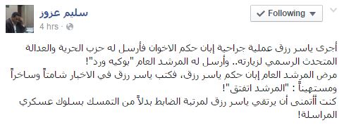 وأمتلأت مواقع التواصل بعدد من التعليقات الغاضبة؛ حيث علق الكاتب الصحفي سليم عزوز، في تغريدة له عبر حسابه الرسمي على موقع التواصل الاجتماعي “فيس بوك” على الخبر قائلاً: “أجرى ياسر رزق عملية جراحية إبان حكم الإخوان فأرسل له حزب الحرية والعدالة المتحدث الرسمي لزيارته.. وأرسل له المرشد العام “بوكيه ورد”!”.