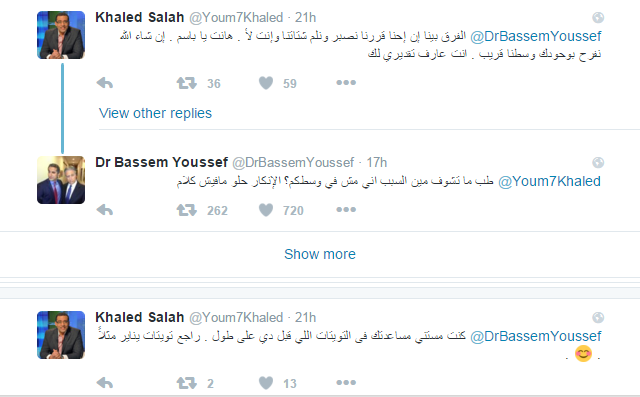 وكان الكاتب الصحفي خالد صلاح، رئيس تحرير صحيفة “اليوم السابع”، قد نشر تغريدة ساخرة تساءل فيها عما “إذا كان شعب مصر من الملائكة حتى يطلب برلمانًا من الجنة أو نوابًا من هارفارد”، ليرد عليه باسم يوسف بتغريدة أثارت الكثير من التعليقات.