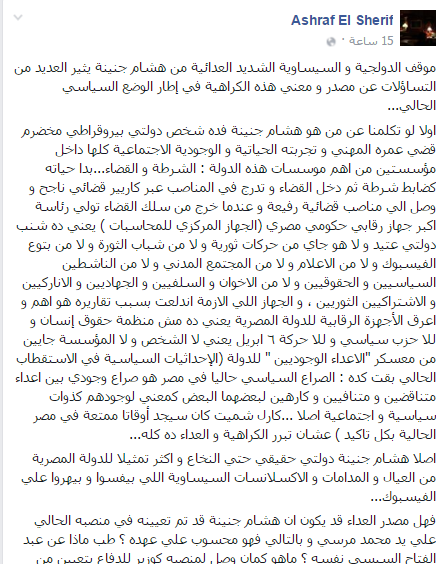وتساءل “الشريف”: “هل مصدر العداء قد يكون أن هشام جنينة قد تم تعيينه في منصبه الحالي على يد محمد مرسي وبالتالي فهو محسوب على عهده؟ طب ماذا عن عبد الفتاح السيسي نفسه؟ ماهو كمان وصل لمنصبه كوزير للدفاع بتعيين من محمد مرسي، وصدقي صبحي (وزير الدفاع الحالي والرجل الثاني في الدولة المصرية حاليا بالنسبة للسيساوية ووفق موازين القوي ايضا) وصل لمنصبه كرئيس للأركان بتعيين من محمد مرسي أيضا ولولا هذا لكان ممكنا أن ينتهي الأمر بالسيسي محافظا لمطروح وصبحي محافظا للوادي الجديد”.