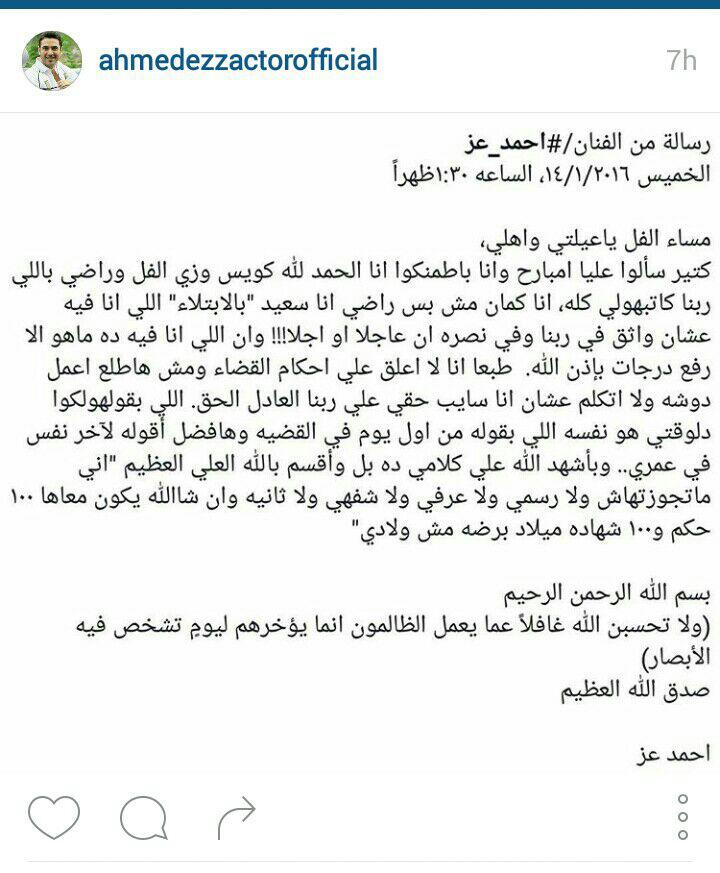 نشرت الصفحة الرسمية للفنان أحمد عز بموقع الصور “إنستجرام” رسالة تعليقا منه على حكم إثبات نسب ابنَي زينة له.