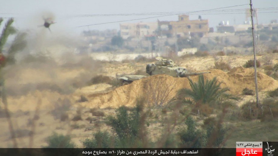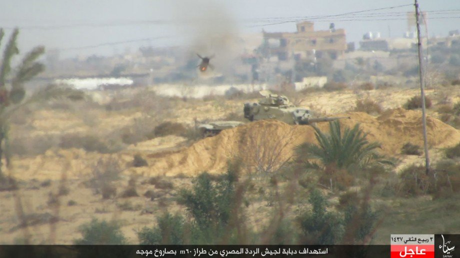 وكتب تنظيم الدولة تعليقات على الصور منها “تصدي جيش الخلافة لحملات جيش الردة”، وأيضا “استهداف دبابة لجيش الردة من طراز m60 بصاروخ موجه”، وكذلك “فرار جيش الردة تاركا آلياته أمام ضربات جنود الخلافة”.