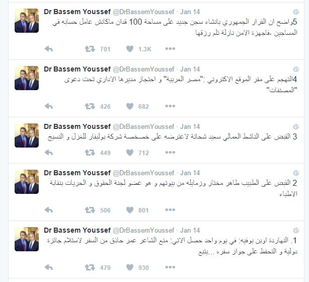 سخر الدكتور باسم يوسف من الاعتقالات الأمنية المكثفة التي تمت مؤخرا ضد النشطاء، وذلك من خلال حسابه الشخصي بموقع التغريدات القصيرة “تويتر”.