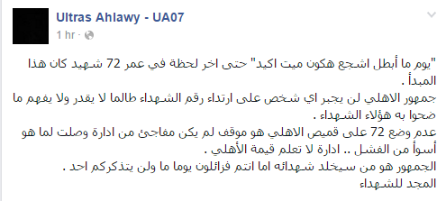 ووصف الأولتراس إدارة الأهلي بـ”الفشلة” في البيان الذي نشر اليوم على صفحتهم الرسمية على “فيس بوك”، مؤكدين أن جمهور الأهلي لن يجبر أي شخص على ارتداء رقم الشهداء.