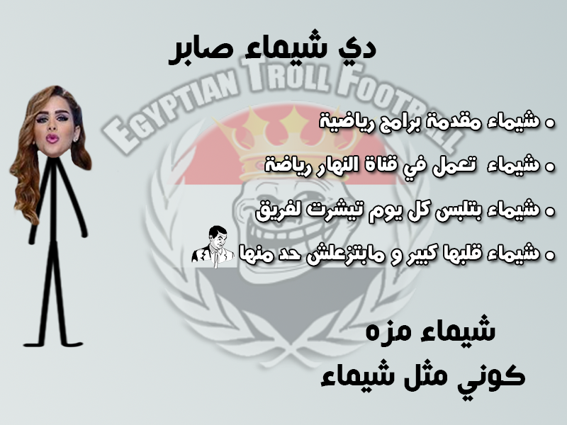 وتطرقت الحملة أيضًا، إلى شيماء صابر، مقدمة البرامج الرياضية في قناة “النهار” الرياضية، وقالت إنها ترتدي كل يوم تي شيرت لفريق، و”قلبها كبير وما بتزعلش حد منها”.