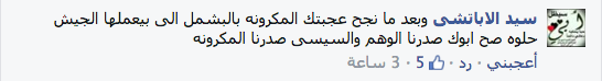 وقال حساب باسم “سيد الأباتشي” على “فيس بوك”: “وبعد ما نجح عجبتك المكرونة بالبشامل اللي بيعملها الجيش حلوة صح أبوك صدرنا الوهم والسيسي صدرنا المكرونة”.