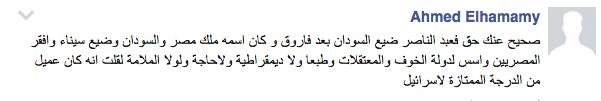 وقال “أحمد الحمامي”: “صحيح عنك حق فعبد الناصر ضيع السودان بعد فاروق وكان اسمه ملك مصر والسودان وضيع سيناء وأفقر المصريين وأسس لدولة الخوف والمعتقلات وطبعا ولا ديمقراطية ولا حاجة ولولا الملامة لقلت إنه كان عميلا من الدرجة الممتازة لإسرائيل”.
