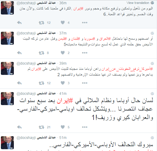 وقال “الشايجي” في عدة تغريدات له على تويتر: “لسان حال أوباما ونظام الملالي في إيران بعد سبع سنوات عجاف انتصرنا، ويتشكل تحالف أوبامي-أميركي-الفارسي- والعرابان كيري وزريف”.