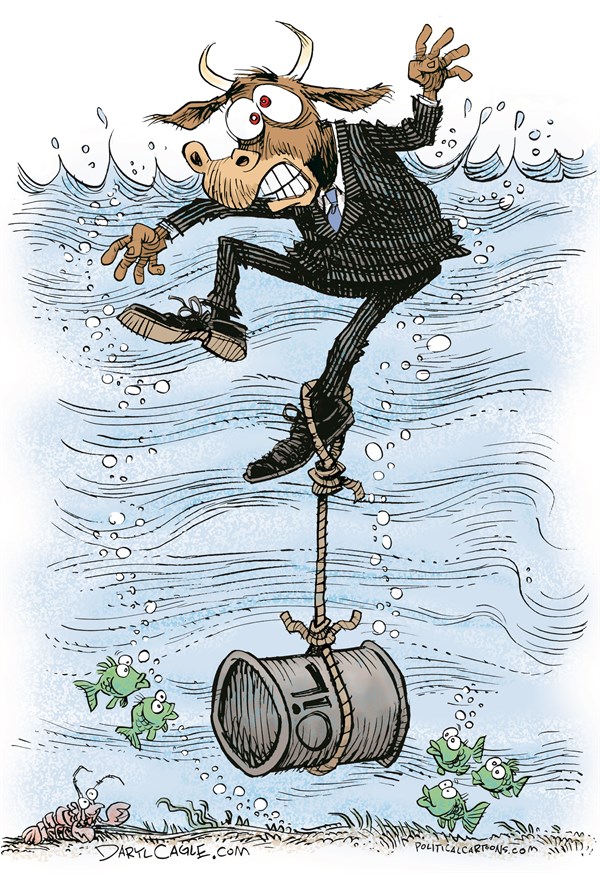 أما عن تأثر البورصة الاميركية بانخفاض اسعار النفض نشر موقع “بولتيكال كارتونز” هذا الرسم: