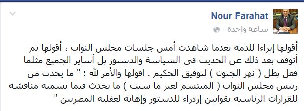 وقال -عبر منشور له على “فيس بوك”-: “أقولها إبراءً للذمة بعدما شاهدت أمس جلسات مجلس النواب، أقولها ثم أتوقف بعد ذلك عن الحديث في السياسة والدستور بل أساير الجميع مثلما فعل بطل (نهر الجنون) لتوفيق الحكيم.. أقولها والأمر لله: “ما يحدث من رئيس مجلس النواب (المبتسم لغير ما سبب) فيما يسميه مناقشة للقرارات الرئاسية بقوانين هو ازدراء للدستور وإهانة لعقلية المصريين”.