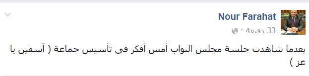 وأضاف ساخرًا -في منشور آخر- “بعدما شاهدت جلسة مجلس النواب أمس أفكر في تأسيس جماعة (آسفين يا عز)”.