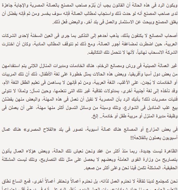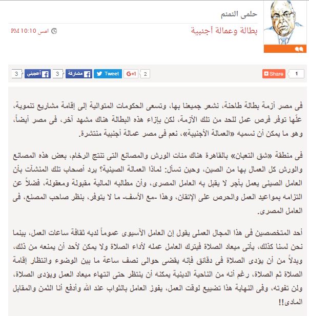 وأضاف -في مقال له نشر في صحيفة الوطن بعنوان “بطالة وعمالة أجنبية”- “كما أن مصر كما تعاني من البطالة، فإن هناك مشهدًا آخر متصدرًا وهو “العمالة الأجنبية”، فمنطقة “شق التعبان” بالقاهرة والتي تمتلئ بمئات ورش ومصانع الرخام كل عمالها من الصين، يفضلهم أصحاب المصانع لالتزامهم وإتقانهم وقبولهم بالراتب”.