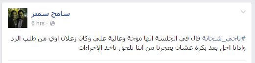 وأكد “سمير” عبر حسابه الشخصي بموقع التواصل الاجتماعي “فيس بوك”، أن ناجي شحاتة أصابه حزن شديد فور علمه بطلب الرد قائلا: “دي موجة وعالية علي”.