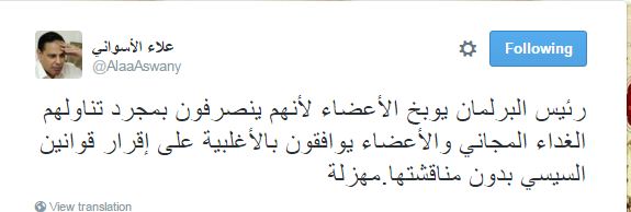 وقال -عبر “تويتر”-: “رئيس البرلمان يوبخ الأعضاء لأنهم ينصرفون بمجرد تناولهم الغداء المجاني والأعضاء يوافقون بالأغلبية على إقرار قوانين السيسي دون مناقشتها.. مهزلة”.
