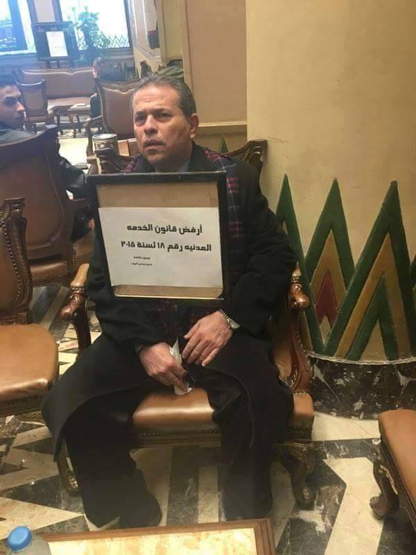 وسجل “عكاشة” رفضه لتمرير قانون الخدمة المدنية رقم 18 لسنة 2015، بأن رفع لافتة بداخل قاعات البرلمان مكتوبًا عليها “أرفض قانون الخدمة المدنية رقم 18 لسنة 2015”.